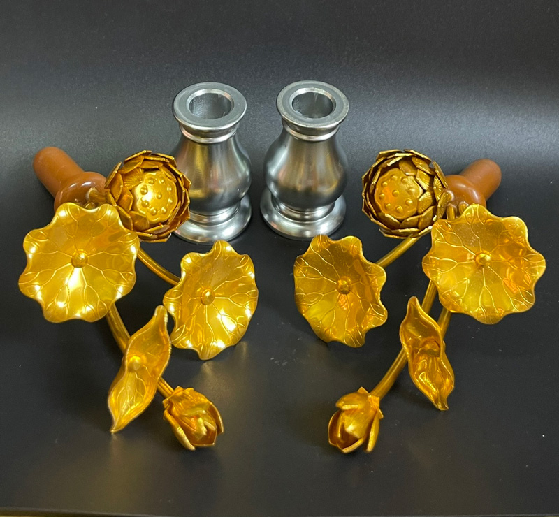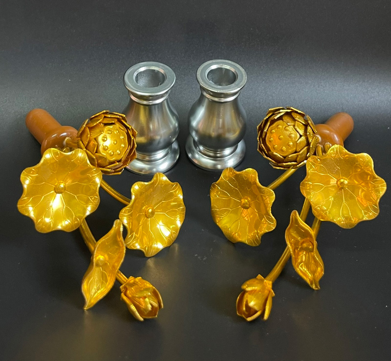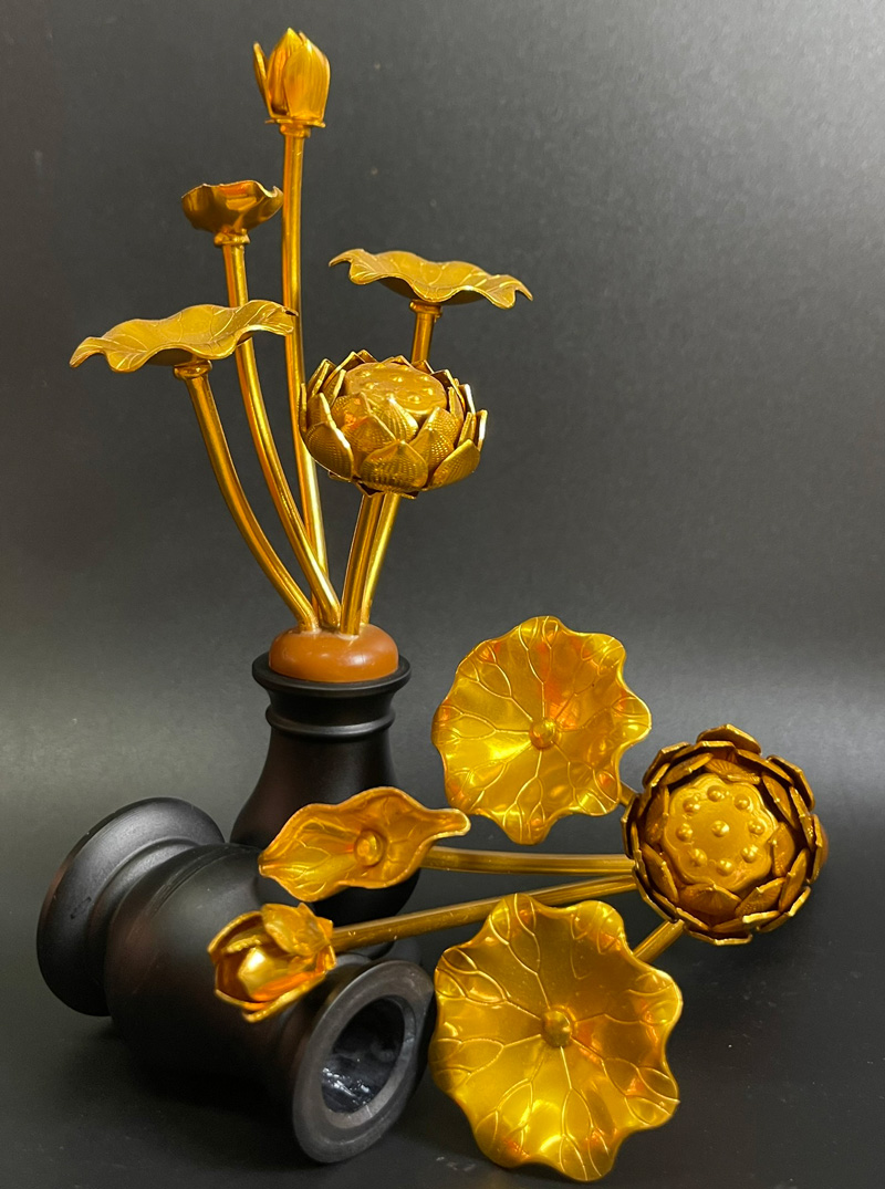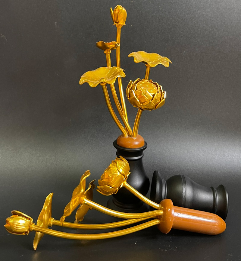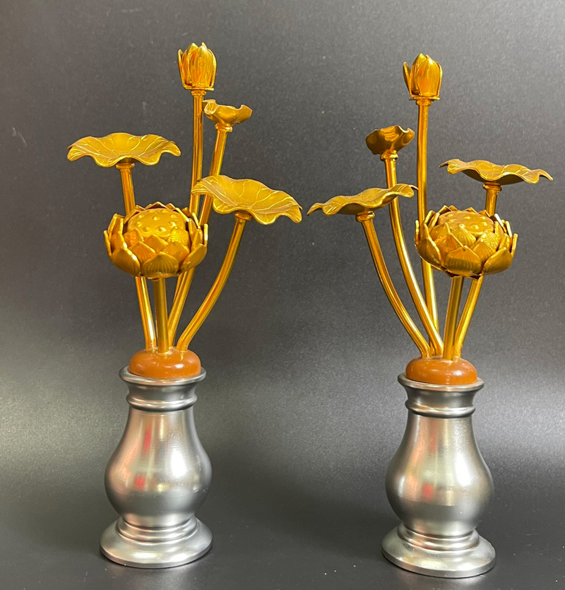 Hoa sen đồng 5 nhánh là một loại vật phẩm thờ cúng rất phổ biến và giàu ý nghĩa tâm linh, thường được cắm trong bình sen đồng và đặt trên bàn thờ Phật, Thần Tài – Thổ Địa, hoặc bàn thờ gia tiên.