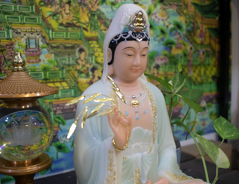 Trong nhà Phật, bộ tượng tây phương tam thánh được chế tác tỉ mỉ với Bồ Tát Ðại Thế Chí cầm cành hoa sen đứng bên tay phải Ðức Phật A Di Ðà. Bên tay trái là Bồ Tát Quán Thế Âm cầm nhành dương liễu và bình tịnh thủy. Trong kinh sách hai vị Bồ Tát hiện thân cư sĩ nữ hai bên Ðức Phật A Di Ðà tượng trưng Từ Bi và Trí Tuệ.